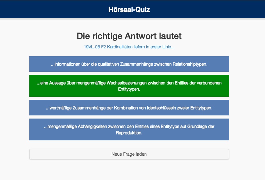 Die Grundidee der Hörsaal-App ist einfach: Der Lehrende projiziert eine Frage mit vorgegebenen Antwortmöglichkeiten (im Regelfall Single-Choice-Fragen) im Hörsaal, die Studierenden übermitteln anonym (meist mittels der eigenen Endgeräte) ihre Antworten. Unmittelbar nach jeder Frage liegen die Ergebnisse in Form eines aggregierten Diagramms vor und können diskutiert werden. Die Registrierung ist gratis und unkompliziert. Auf der Plattform befindet sich im Fachbereich der Wirtschaftsinformatik eine Vielzahl an vorgefertigten Quizzfragen, die verwendet und adaptiert werden können. Aber auch die Erstellung von eigenen Umfragen ist sehr einfach und intuitiv bedienbar.