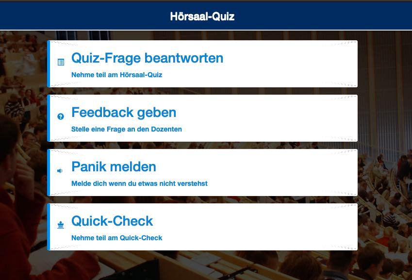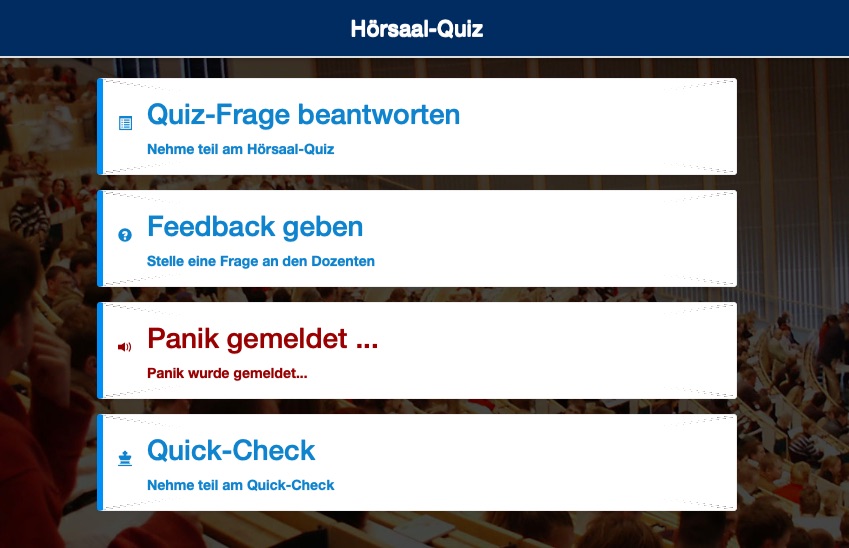 Der Einsatz von Audience-Response-Systemen (ARS) überwindet den klassischen Frontalunterricht und ermöglicht den unmittelbaren Austausch zwischen Studierenden und Dozenten. In diesem Rahmen wurde am LSWI die Hörsaal-App entwickelt, die eine direktere und aktivere Kommunikation zwischen Lehrenden und Hörern während der Vorlesung ermöglicht. Es können sowohl inhaltliche Fragen gestellt werden als auch unzureichendes Verständnis durch einen „Panik Button“ signalisiert werden - natürlich ganz anonym.